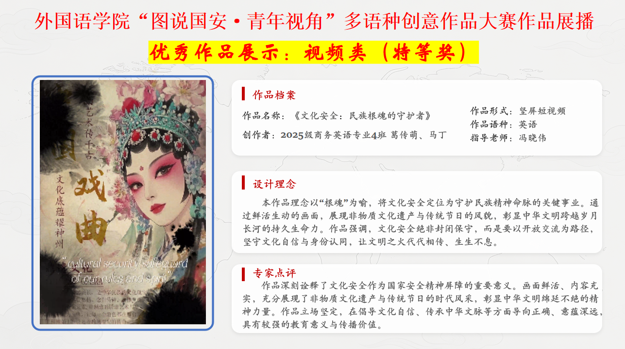 本次活动自3月10日启动,面向全院征集围绕文化安全、网络安全、生物安全等主题的多语种海报及短视频作品,鼓励学生以外语专长讲述国家安全故事。活动累计收到涵盖英、法、日、韩等语种的创意作品数十件,经专家团综合评审,一批优秀作品分获各类奖项。